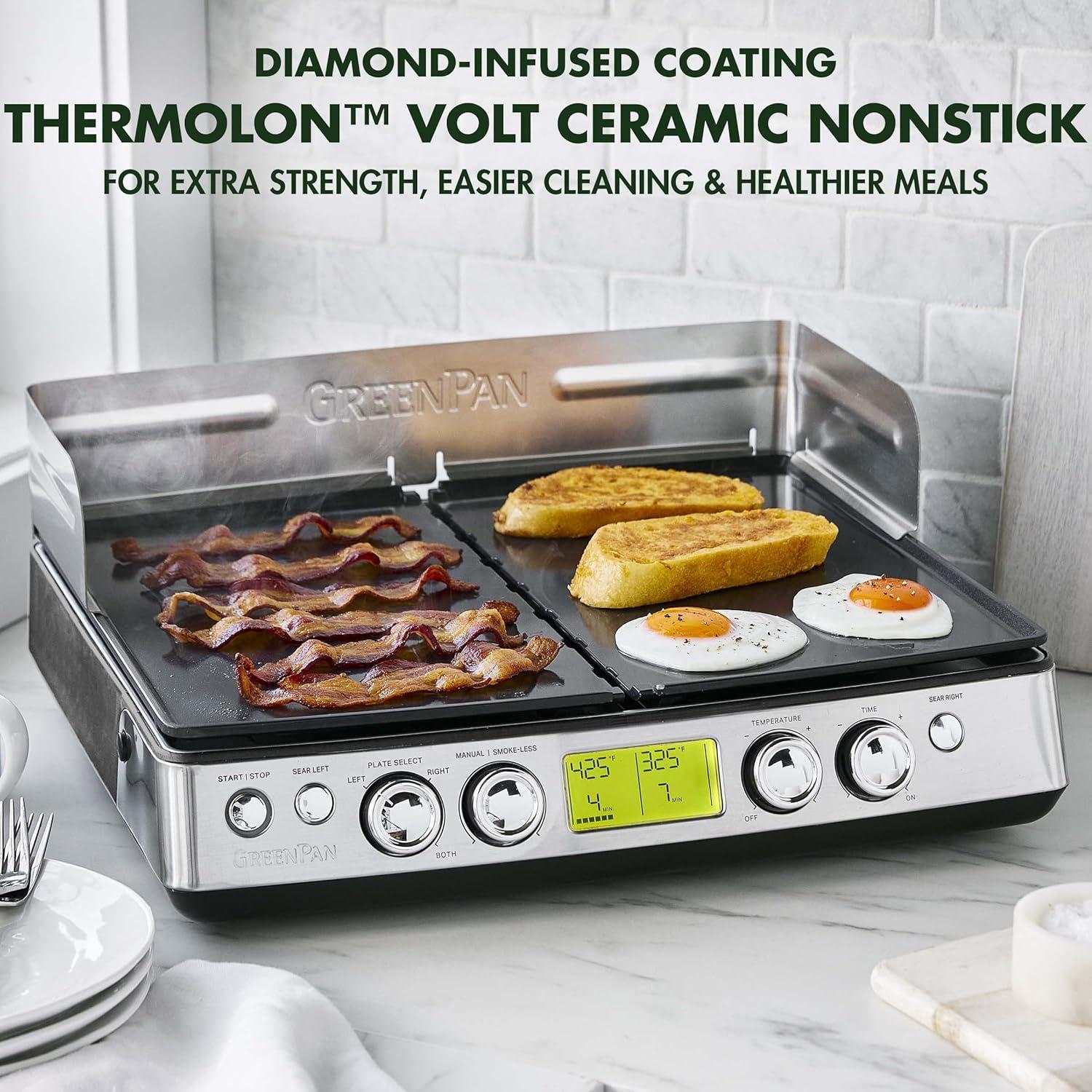 Designed for maximum power and indoor grilling, the GreenPan Elite XL Smoke-Less Grill & Griddle delivers superior results with interchangeable cast aluminum plates, embedded heating elements, and GreenPan’s PFAS-free ceramic nonstick coating. The easy smoke-less presets automatically adjust to minimize smoke no matter what you’re cooking. GreenPan’s Thermolon Voltä coating is free of PFAS, PFOA, lead, and cadmium to bring healthy cooking anywhere with an outlet. The diamond-infused ceramic nonstick delivers quick and even heating and won’t break down the way traditional coatings do. Use as a full griddle, a full grill, or a versatile mix for an expansive cooking experience. Rinse the removable plates clean toss them in the dishwasher to make cleaning simple.
