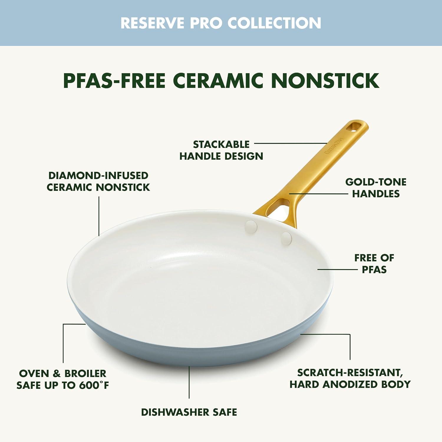 RESERVE PRO: This collection is where high-performance cooking meets refined design. Featuring GreenPan’s most advanced ceramic nonstick, this collection delivers exceptional durability, stackable convenience, and oven-ready strength.