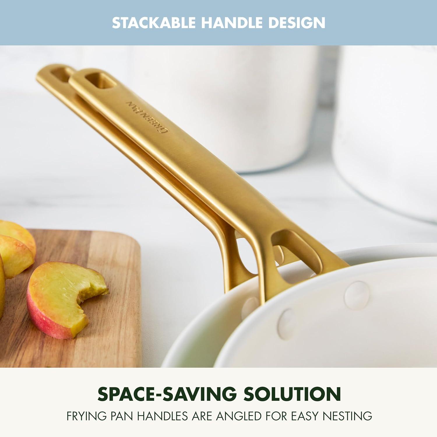 GreenPan has modernized their bestselling collection with subtle architectural details inspired by neoclassical design that add a stunning contemporary statement in any kitchen. As innovative as they are dazzling, these pans are crafted from ultra-durable hard anodized aluminum for remarkable durability and incredible scratch resistance. Each pan features GreenPan’s cutting-edge Thermolon™ 9G ceramic nonstick for ultimate nonstick performance, remarkable release, and unbelievable durability. The first NSF®-certified ceramic nonstick, it’s infused with layers of diamonds for 10x longer lasting performance than classic ceramic nonstick and free of PFAS for effortless toxin-free cooking. The domed glass lids have rims that match the body for a sleek, streamlined look while offering an easy view of your meal in progress. The striking gold-tone stainless steel handles add an eye-catching contrast and they’re angled so the frypans can stack easily and save space. Designed for maximum versatility, these pans are dishwasher safe, oven and broiler safe up to 600˚F, and optimized for all stovetops expect induction. Bring refined dining and elegant cooking home with Reserve Pro.