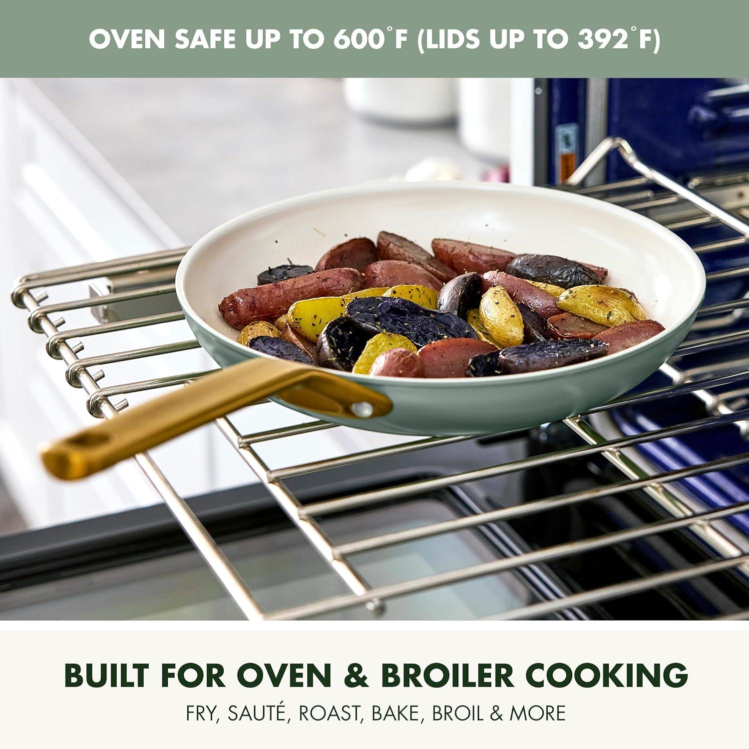 GreenPan has modernized their bestselling collection with subtle architectural details inspired by neoclassical design that add a stunning contemporary statement in any kitchen. As innovative as they are dazzling, these pans are crafted from ultra-durable hard anodized aluminum for remarkable durability and incredible scratch resistance. Each pan features GreenPan’s cutting-edge Thermolon™ 9G ceramic nonstick for ultimate nonstick performance, remarkable release, and unbelievable durability. The first NSF®-certified ceramic nonstick, it’s infused with layers of diamonds for 10x longer lasting performance than classic ceramic nonstick and free of PFAS for effortless toxin-free cooking. The domed glass lids have rims that match the body for a sleek, streamlined look while offering an easy view of your meal in progress. The striking gold-tone stainless steel handles add an eye-catching contrast and they’re angled so the frypans can stack easily and save space. Designed for maximum versatility, these pans are dishwasher safe, oven and broiler safe up to 600˚F, and optimized for all stovetops expect induction. Bring refined dining and elegant cooking home with Reserve Pro.