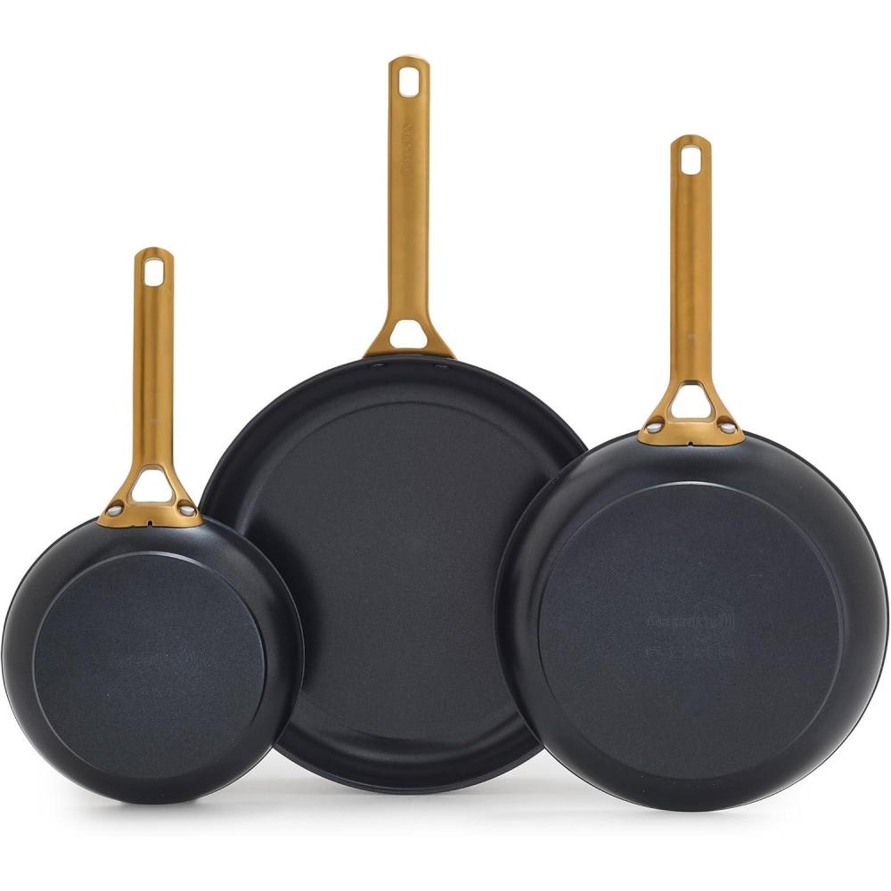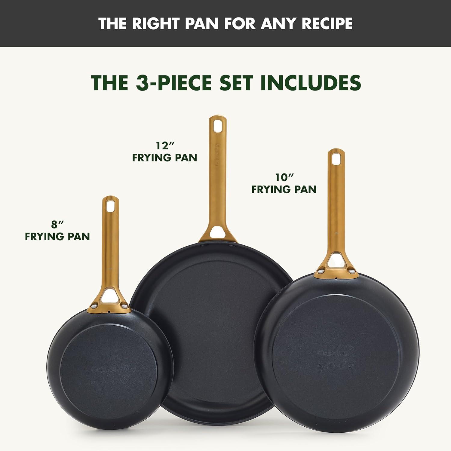 3-PIECE FRYING PAN SET: Includes 8″ for single servings and sides, 10″ for eggs, grilled cheese, and veggies, and 12″ for steaks, stir-fries, and pancakes.