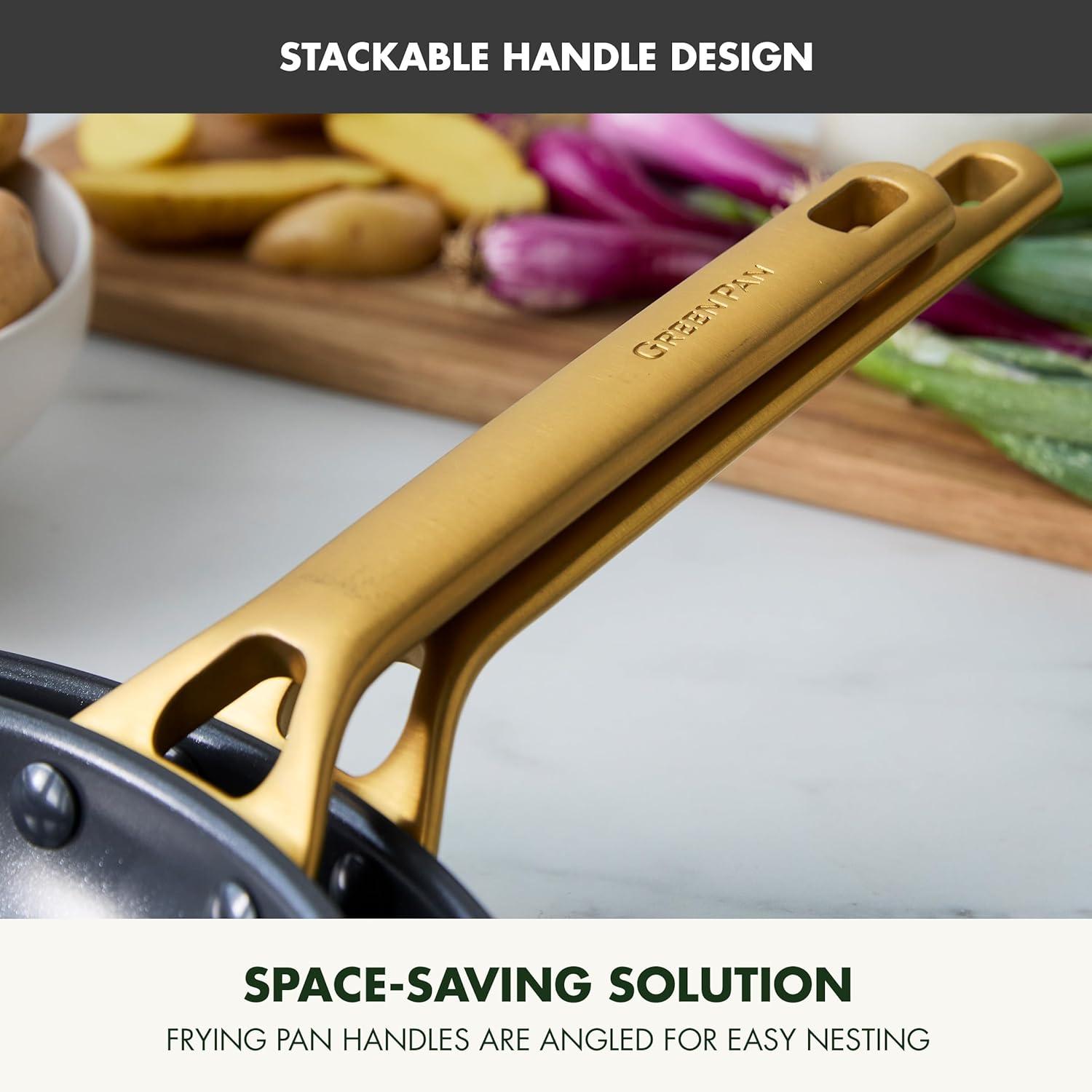 GreenPan has modernized their bestselling collection with subtle architectural details inspired by neoclassical design that add a stunning contemporary statement in any kitchen. As innovative as they are dazzling, these pans are crafted from ultra-durable hard anodized aluminum for remarkable durability and incredible scratch resistance. Each pan features GreenPan’s cutting-edge Thermolon™ 9G ceramic nonstick for ultimate nonstick performance, remarkable release, and unbelievable durability. The first NSF®-certified ceramic nonstick, it’s infused with layers of diamonds for 10x longer lasting performance than classic ceramic nonstick and free of PFAS for effortless toxin-free cooking. The domed glass lids have rims that match the body for a sleek, streamlined look while offering an easy view of your meal in progress. The striking gold-tone stainless steel handles add an eye-catching contrast and they’re angled so the frypans can stack easily and save space. Designed for maximum versatility, these pans are dishwasher safe, oven and broiler safe up to 600˚F, and optimized for all stovetops expect induction. Bring refined dining and elegant cooking home with Reserve Pro.