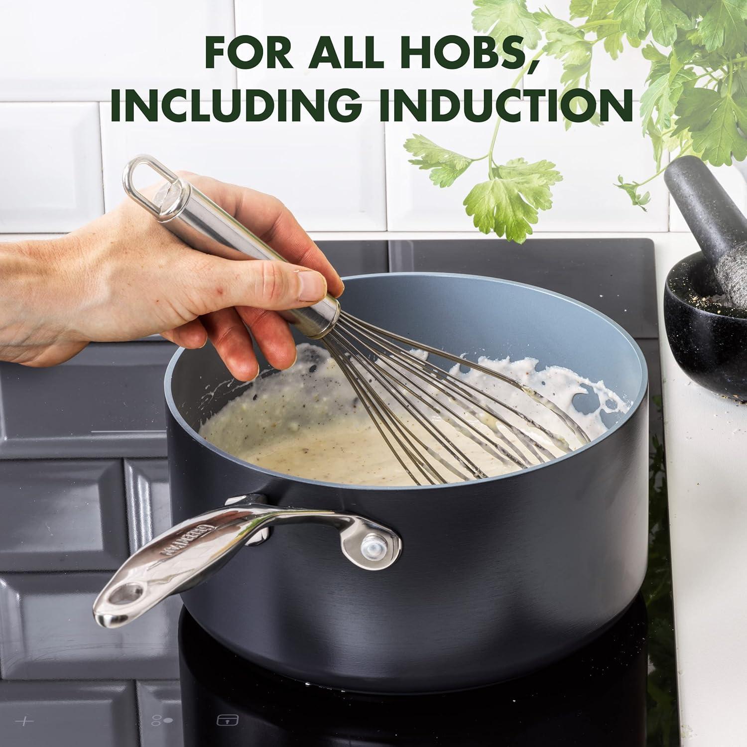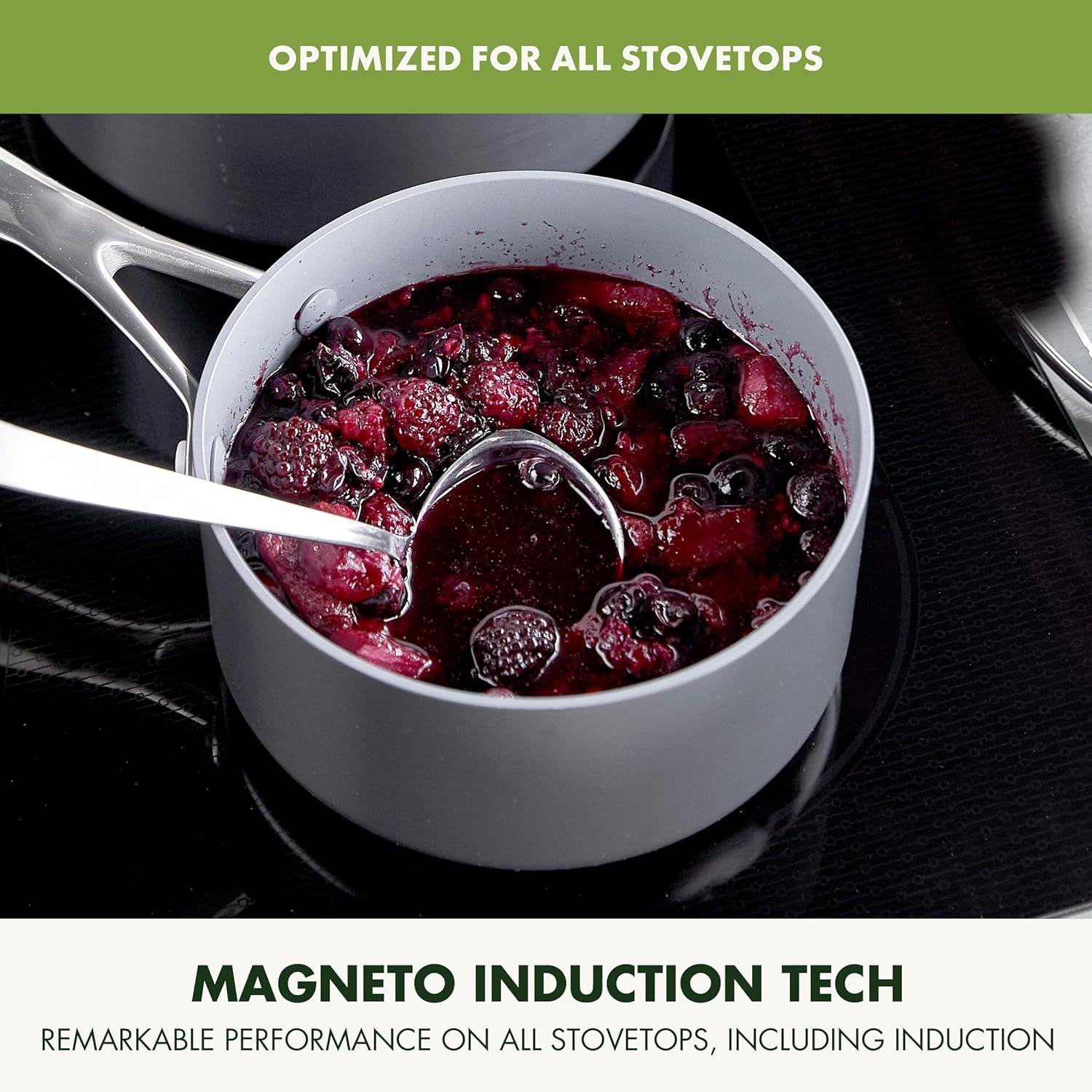 Valencia Pro brings together over a decade of innovations in one incredible collection. Designed to last, this 1.6-quart and 3-quart saucepan set is crafted with strengthened hard anodized aluminum for extra durability and scratch resistance. Each pan features a sturdy Magneto base for superior induction efficiency so you can brown, sauté, and sear without heat loss on any stovetop, including induction. Each of these pans features our Thermolon Minerals Pro ceramic nonstick, a diamond-infused coating that’s metal utensil safe and designed to stand up to intense use while giving you even heating, effortless release, and easy cleanup. The pair’s stainless steel handles let you go from stovetop to oven with ease and the dishwasher safe design makes cleaning up big messes stress-free..