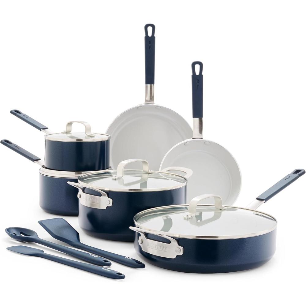 GreenPan x Bobby Flay 13 Piece Nonstick Cookware Pots and Pans Set, PFAS-Free Diamond Ceramic, Induction Suitable, Easy Clean Dishwasher & Oven Safe, Stay-Cool Silicone Handles, Glass Lids, Graphite(Oxford Blue)